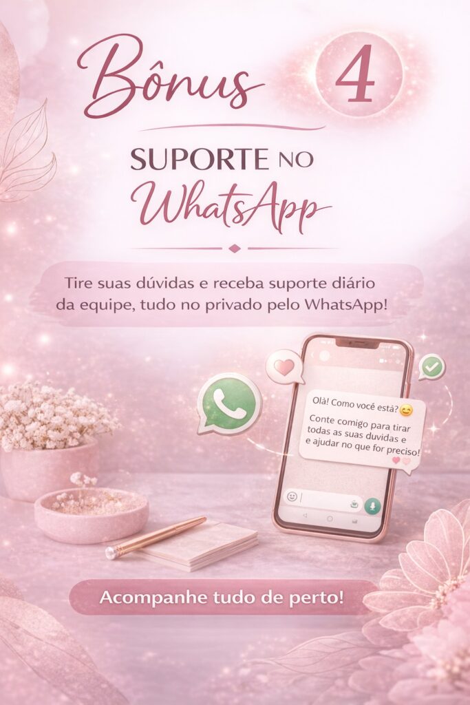 Você terá suporte pelo WhatsApp para tirar dúvidas, receber orientações e se sentir mais segura na aplicação do método. É um suporte individual pensado para te acompanhar no processo.